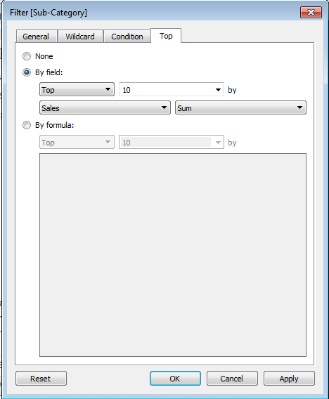 Step5: And, choose the " By field " option. From the next drop-down, choose the option Top 10 by Sales Sum as shown in the below screenshot.