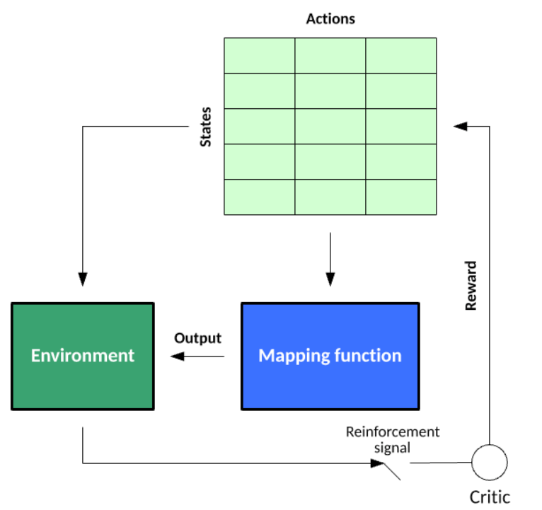 In contrast to supervised learning, where a critic grades each example, reinforcement learning allows the critic only to give a degree when the goal state is reached (having a hand with the state of 21).